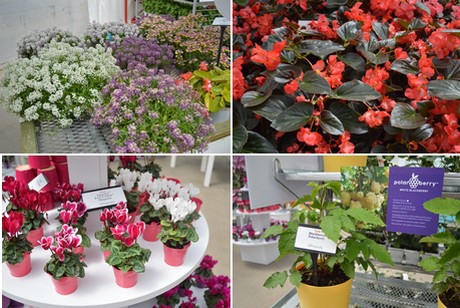 Clockwise: Passionaria Dark Purple Lobuiaria is one variety of the new Passionaria series, that consists of three varieties. The plants in these series have deep colors. They are bred for good branching and ease of growth. The Whopper Rose with Bronze Leaf is part of the Whopper series begonia. Three begonias in this series have been improved for better uniformity and more flower power. Whopper produces large flowers, up to 3 inch across and keeps blooming from Spring through the end of Fall. The Polar Berry Blackberry is a new white blackberry. The canes grow to 4 to 5 ft. The Smartiz Fantasia Series Cyclamen of Morel is the smallest Fantasia cyclamen and has a low sensitivity to Botrytis.
