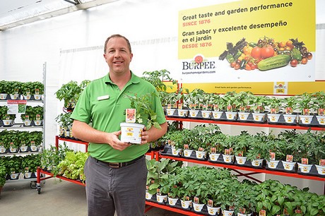 Scott Mozingo of Burpee holding the Beefsteak Tomato Oh Happy Day. It's new concept in tomatoes with an disease-resistance package. It produces a crop of 5 to 6-oz. indeterminate beefsteak tomatoes in clusters of 3 to 7 fruit. Resists Early Blight, Late Blight, Verticillium and Fusarium.