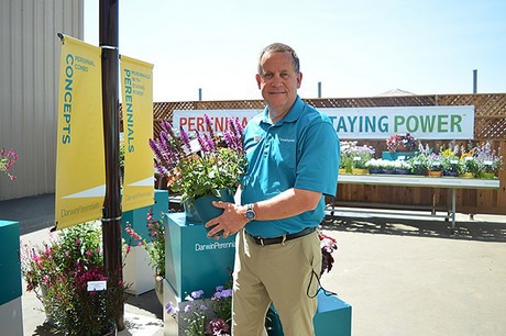 Mike Klopmeyer of Darwin Perennials holding the Salvia nemorosa Rose Marvel.