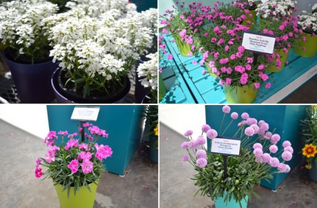 Clockwise: Snowsation Iberis is a compact iberis with large flowers. The plant's flower uniformly and branch freely. It is hardy to zones 4a to 9a. Dianthus Mountain Frost Pink PomPom has double rose-pink flowers and flowers from early Spring until Autumn. It requires no vernalization to flower, is tolerant of rainy and wet conditions and has a tidy mounding habit. Armeria Dreameria Sweet Dreams is an inter-species hybrid that provides frost-to-frost flowering in containers or in the garden. It's heat tolerant and seems to be easy to grow. Dianthus Mountain Frost Rose Bouquet has large deep rose flowers and just like the Pink PomPom, it flowers from early Spring until Autumn. It requires no vernalization to flower, is tolerant of rainy and wet conditions and has a tidy mounding habit.