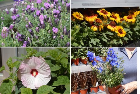 Clockwise: Bandera Pink Lavendula is a new introduction to the seed L. stoechas series. This lavendula has large soft pink flags on spikes with deep rose flowers. It is hardy to zone 7a to 10b. Gaillardia Mesa Bright Bicolor is a F1 gaillardia from seed. It is an early-flowering plant that maintains its controlled height when filling quart and gallon containers quickly. Once established it is drought tolerant and the color of the flower has a non-fading color all season. Delphinium Diamonds Blue is a F1 spurless delphinium from seed. It eliminates the need for tissue culture inputs and is said to be supplied with up to 25% higher germination than O.P. types for more efficient young plant production. Hibiscus Luna Pink Swirl is a busy well-branched plant without pinching. It has many 6-8 inch flowers and is very responsive to PGRs.