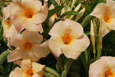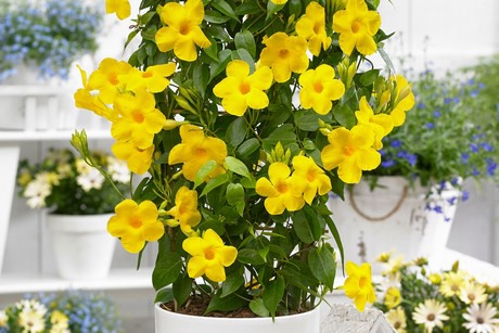 Mandevilla Bloom Bells Yellow is an early flowering plant and its big, dark yellow flowers which remain on the plant for a long time make it a good addition to this series which was only available as red and pink cultivars until now.