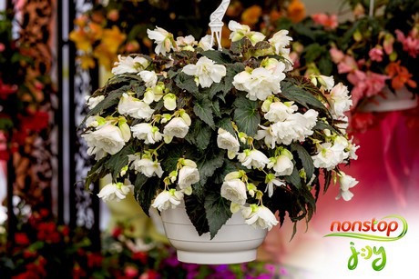 This Begonia tuberhybrida F1 Nonstop Joy Mocca White is a new introduction of German Breeder Benary. The Joy Mocca is a semi-trailing begonia from seed, seems to be easy to grow, sleeve and ship.