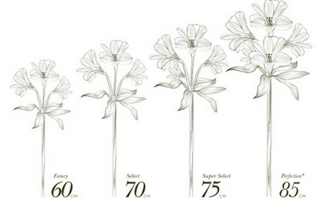 Four categories of alstroemerias grown by La Plazoleta; Fancy, Select, Super Select and Perfection.