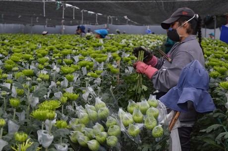 The chrysanthemums are being harvested, directly sleeved and put in water with nutrition.