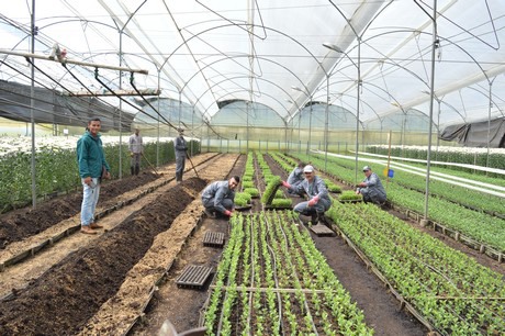 On the left side of the picture, two beds are being prepared for the next planting and on the right side, two beds are being planted with young plants. A production cycle of chrysanthemums takes about 15 weeks.