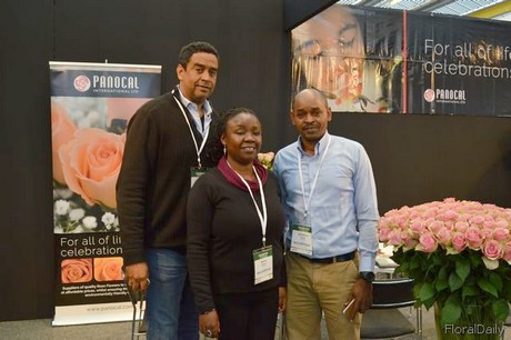 Paul Wekesa, Mercy Njugua and Boniface Kiama presenting cut rose variety Belle Rose at the IFTF in Vijfhuizen, the Netherlands.