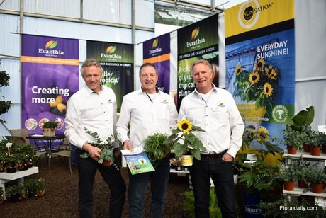 Leo Lievaart, Nico Grootendorst and Luit Mazereeuw of Evanthia presenting the Eucalyptus pulverulenta, Cyperus Zumula and Helianthus Sunsation.