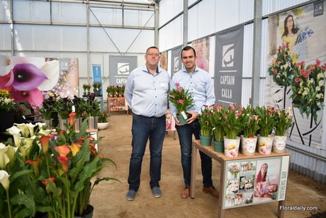 Wim Kleine and Lennaert Kapiteijn of Kapiteyn Flower Bulbs presenting Captain Cheerio, a new pink variety that has a cultivation time of 8-10 weeks. Just like all other Captain Callas, this variety is available year round, colors fast, has a long shelf life and has a lot of flowers.