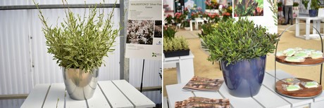 Walberton's Silber Fountain is a Gaura bred by Walberton. It has stable variegated foliage, sterile pure white flowers, repeat blooming, nectar rich blooms that attract pollinating insects and a compact mounding habit, 24"x24"with flower spikes. Royal Hawaiian Hawaii Magic is a Leucadendron with a compact busy habit (3'x 2 at maturity), foliage that changes color throughout the season. Click here for the enlarged picture.