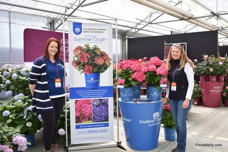 Any LeBard and Natalia Hamill of Bailey Nurseries presenting their new hydrangea Summer Crush. It is the newest and fifth introduction in the Endless Summer collection. This hydrangea has raspberry red mopheads and is more compact (w:18xh:36).