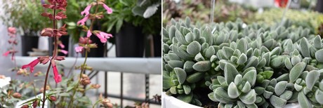 On the left: Salvia Kisses and Wishes On the right: Crassula Deceptor Stone Age Silver. It is a succulent and evergreen low growing dense textured plant, with silver-gray foliage and interesting shape, easy to grow, low maintenance, deer resistant, drought and salt tolerant. Click here for the enlarged picture.