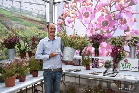 Asaf Nir of Nir Nursery holding their new variety Rey. Rey is a new intergeneric cross between chamelaucium and verticordia has recently been put on the market. It is different to a wax flower; "the branch structures, leaves and flowers are completely different from what many probably know for a wax flower". The flower is big with a fuchsia pink color and the flowers last for about 2 to 3 months.
