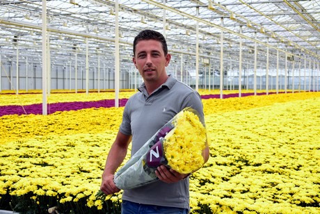 Danny van Uffelen in the greenhouse of Van Uffelen Flowers holding spray chrysanthemum Celebrate, a variety that is doing very well in Russia, their main market.