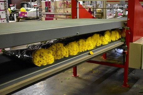 And when the flower is ready, it can be harvested checked, packed and cooled. It is a process that is as important as the cultivation itself. At Van Uffelen Flowers much is being done automatically; from planting the cuttings to sleeving the bunches. The only manual labor that is needed is placing the automatically cut flowers on the belt and placing the sleeved bunched in the boxes. Below the process in pictures.