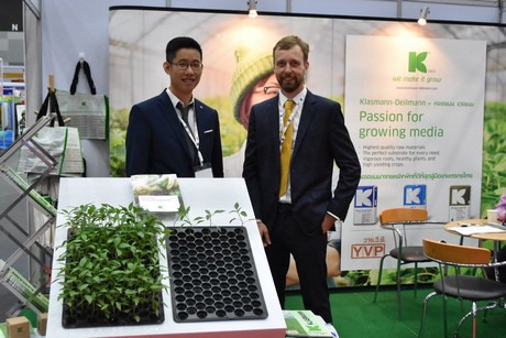 Michal Hwang & Bert Desmet showing the Growcoon on behalf of Klassman-Deilman. The Growcoon was recently tested on commercial scale by two Australian growers and after investing in the Dispenser they are expected to grow with the plug on larger scale. Also in Taiwan, Japan and China the plug is gaining ground.