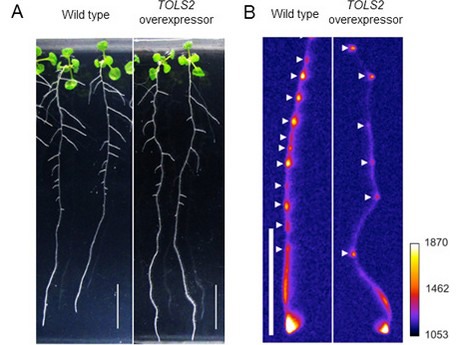 Figure 1: Overexpression of TOLS2 gene decreases the number of lateral root founder cells and later roots. A: Arabidopsis wild-type (left) and TOLS2 overexpression type (right). 10-day growth. Scale is 1 cm. B: The expression of DR5:LUC gene in the roots of Arabidopsis wild-type (left) and TOLS2 overexpressor (right). White arrows indicate lateral root founder cells. The scale is 1 cm.