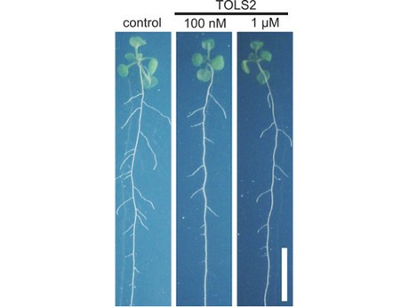 Arabidopsis wild-type (Col) control specimen and two specimens raised in a culture including TOLS2 peptide (100 nM and 11 M strengths). 10-day growth. Scale is 1 cm.