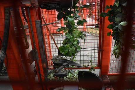 In the processing hall a group of employees is hard at work. The large carton boxes are unpacked and transported away by conveyor belt for recycling.