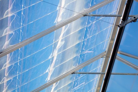 The roof of the Daylight Greenhouse offers an alternative to other systems that protect greenhouses from the sun. It collects direct sunlight in the Plexiglas Fresnel lenses, leaving the interior of the greenhouse bathed in uniform, diffuse light, which has a positive effect on plant growth. Source: Technokas