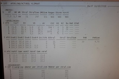 With the units growers can remove 4.5 liters of moisture from the air with one kilowatt hour at 18 degrees and an RH of 80 percent. The water runs along the panels in the unit to a container where it is collected and discharged via a hose. Besides drier greenhouse air, the main advantage is energy saving, says Eef. "I have examples where in the DryGair departments the tube temperature is at 0 degrees while in the control department a tube of 30 degrees is needed. In addition, the moisture guzzlers have a positive effect on the RH, AH, MD."