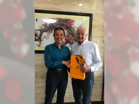 Mr Jiang Deshen, Chairman of The Hongyue Horticulture Co.Ltd, and Raymond Evison OBE, Founder and Chairman of The Guernsey Clematis Nursery Ltd at a meeting held in China in October 2018.