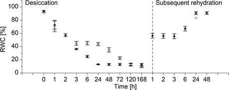 Figure 2. Changes in the relative water content (RWC %) during desiccation and subsequent rehydration in Haberlea rhodopensis (♦) and Deinostigma eberhardtii (◊) respectively (Kuroki, S. et al. Water molecular structure underpins extreme desiccation tolerance of the resurrection plant Haberlea rhodopensis. Sci. Rep. (2019). doi:10.1038/s41598-019-39443-4)