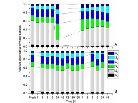 Figure 3. Dynamics of different water species during dehydration and rehydration of Haberlea rhodopensis and Deinostigma eberhardtii. Relative absorbance of water species in Haberlea rhodopensis (A) and Deinostigma eberhardtii (B), during desiccation and subsequent rehydration (Sr – protonated water clusters, S0 – free water molecules, S1 – water dimers, S2, S3 and S4 – water molecules with 2, 3 and 4 hydrogen bonds, respectively) (Kuroki, S. et al. Water molecular structure underpins extreme desiccation tolerance of the resurrection plant Haberlea rhodopensis. Sci. Rep. (2019). doi:10.1038/s41598-019-39443-4)