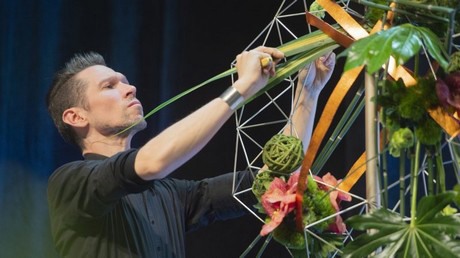 The 2019 FTD World Cup Champion, Australia’s Bart Hassam, puts the finishing touches on his arrangement, which took first place. (Photo by Jonathan Wilson for WHYY)