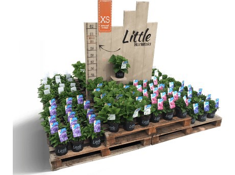 To stimulate sales even more, a wooden display has been designed. The wooden pallets provide a natural look. A ruler is attached on the display to indicate how large the hydrangeas will grow (60 cm in 5 years). In many garden centers and other sales points the hydrangeas are easily identified by the wooden display.