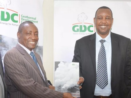 Mr Gershom Otachi Bw’Omanwa (left) the Chairman, GDC Board of Directors receives a copy of the GDC Financial Report for the year 2017-2018 from the company’s Managing Director and CEO Eng. Johnson P. Ole Nchoe. GDC has started to make profits mainly from steam-sales to KenGen