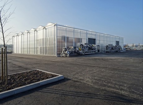 Another important improvement is the test center that was built behind the warehouses. “The test center is really one of a kind. It's a 1000 m2 Venlo greenhouse, modified specifically to serve our needs. The greenhouse with its six roofs has tracks on both of its gables, on which we can place a platform with roof washers or chalk machines. Because of this, we have the opportunity to extensively test our machines before sending them to our customers. This is not only the case for the machines we sell but also for all of the new developments we invent and want to test before bringing them to market in the future”, says Marcel Koolmees.