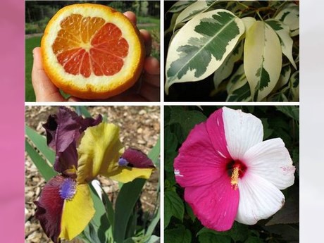 Photo 1. Naturally occurring plant color mutations. Photos credits: orange – Forest Starr and Kim Starr, CC BY 2.0; ficus – public domain; iris – Bob Gutowski CC BY-NC-SA 2.0; hibiscus – Dariusz Malinowski CC BY-NC-ND 2.0.