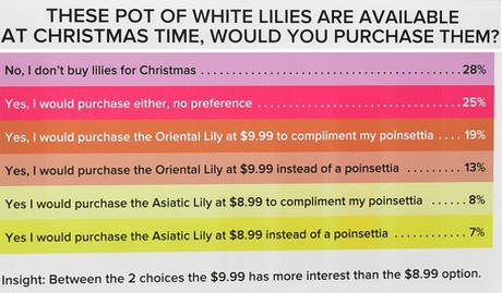 So, in order to convince the grower that there are more crops that have good potential during the Christmas season, van der Lans decided to conduct a survey among US consumers. "Together with Home Garden Panel (a Metrolina greenhouse company), we surveyed over 500 US consumers and showed them 2 L.A. Hybrids - one Oriental Lily for 9.99 USD and one Asiatic Lily for 8.99 USD - and asked them one question and gave them 6 answers to choose from."