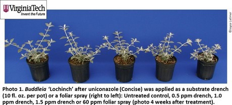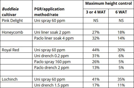 In summary, Buddleia is generally responsive to either uniconazole or paclobutrazol. However, the response varies with cultivar. Therefore, you will need to run your own trials or start with lower application rates and make additional applications as necessary. Once you narrow down the rate, consider planning on making a second application later in the crop cycle to attain season long control.