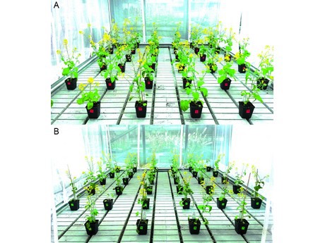 Brassica rapa in the greenhouse experiment without (A) and with caterpillar infestation (B). (Image: Florian Schiestl, UZH)