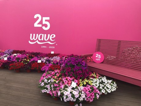 This year marks the 25th anniversary of PAS Wave petunia. For the past 25 years, in order to provide the growers and customers with better product, PAS has introduced a series of exciting new varieties. This year, they're showcasing 29 colors in total from the Wave, Easy Wave, Shock Wave, and Tidal Wave series, including the All-America Selections National Winner—Carmine Velour Wave and New Lavender Sky Blue Easy Wave, which is colored like the blue sky.