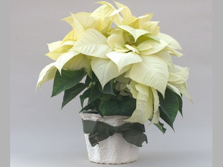 "The shorter version of the pure white bract assortment from Rinehart. 4 to 6-inch pots size is ideal for this new variety. With a more compact habit than Pure White, growers have now two good tools to supply an exceptional white flowering Poinsettia to their customers. Jack Frost showed in trials a very high heat tolerance."