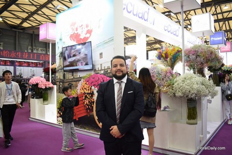 Santiago Jara of ProEcuador in front of the ProEcuador pavillion at the Hortiflorexpo IPM Shanghai, hosting 8 Ecuadorian flower exporters.