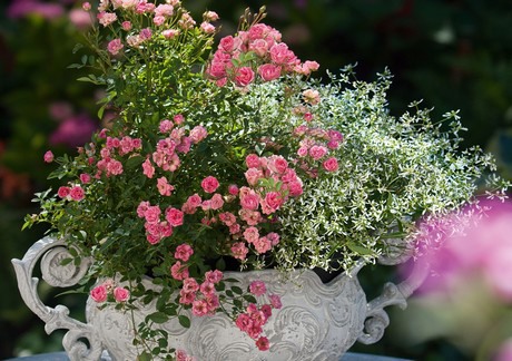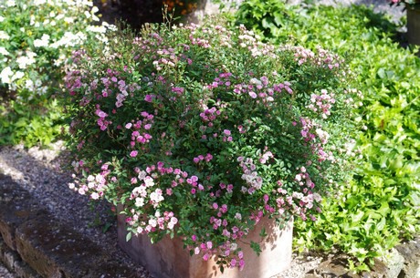LillyRose is a compact growing rose with small pink flowers. It starts flowering by mid-May and flowers till frost. It grows to about 40cm high and survives even the tougher central European winters. The delicate shrub is well branching and can be planted together with other bedding and balcony-plants (click here for some examples). It is suitable for small pots and bigger containers and can be grown in small pots from 12cm (one plug) up to larger containers of 3-5 litre, using three or more plugs. Planted in the garden, it proved to have a high resistance against all kind of traditional rose diseases.