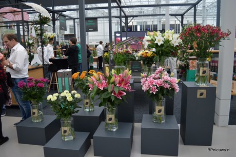 The novelties. The four varieties in the back row, from right to left: Florinca "Cherry" by Together2Grow, Longliflorum "Fredo" by Moerman Lilium, Freesia "Orion" by Hofland Freesia and Chrysanthemum "Bella Vista" by Arcadia Chrysanten. The four varieties in the front row, from right to left: "Roselily Samantha" and "Peter Schenk", both by Moerman Lilium followed by "Alibaba" and "Andrea" by Arcadia Chrysanten.