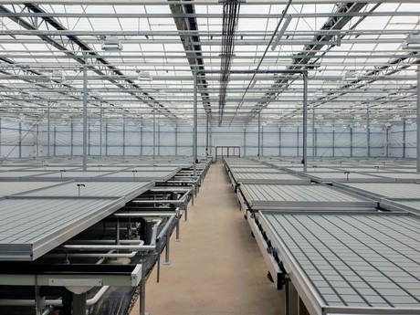 “The floor area of the glasshouse is 2,944 m2 and the height of the Venlo structure is 5.5 meters”, says David Summerfield of Bridge Greenhouses. “It is 40 metres long with 4 metre sections and 73.6 metres wide with 3.20 metre bays on lattices varying between 6.4 metres and 16 metres.”
