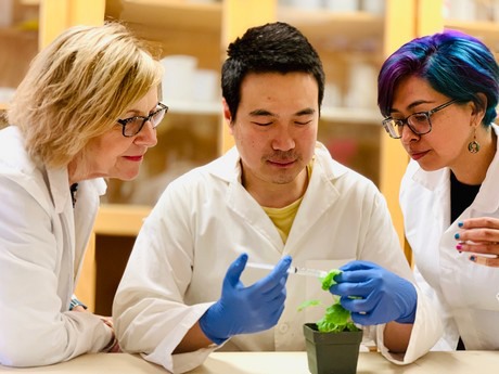 A major discovery was published by Texas A&M University’s Shippen Lab. Pictured are lead researcher Dorothy Shippen, Ph.D., (left), graduate student Jiarui Song, first author (center) and postdoctoral fellow Claudia Castillo-González, second author (right). (Texas A&M photo)