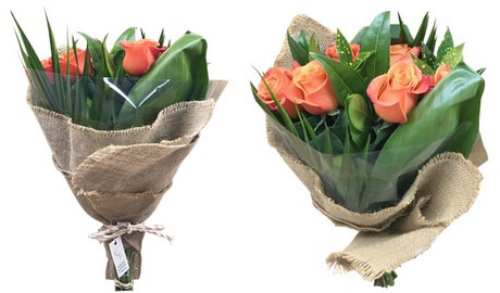 These bouquets include a decorative jute sleeve, a biodegradable vegetable-based clear sleeve, and flower food. "The nice thing about the jute sleeve is that it gives the bouquet an eco-friendly look. Also, the end-consumer can use it as part of the decoration folding it down to cover the vase with it."