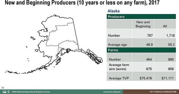 Alaska leads the nation in the percent of new and beginning producers. Almost half – 46 percent – of the state’s farmers have 10 years or less experience on any farm. In the United States, 27 percent of all producers are new and beginning.