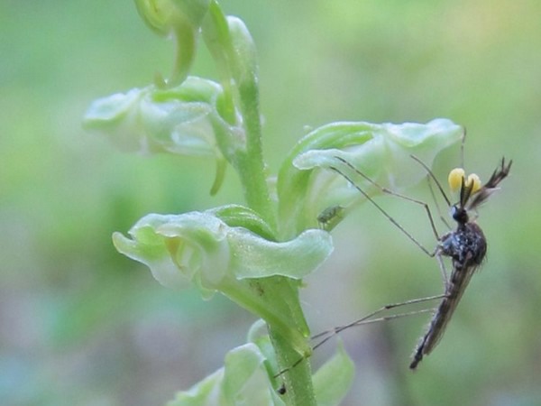 An Aedes mosquito with pollen sacs on its eyes feeding from Platanthera flowers. Credit: Kiley Riffell