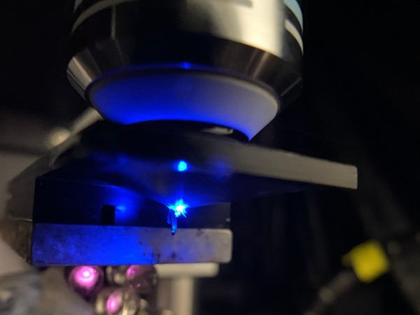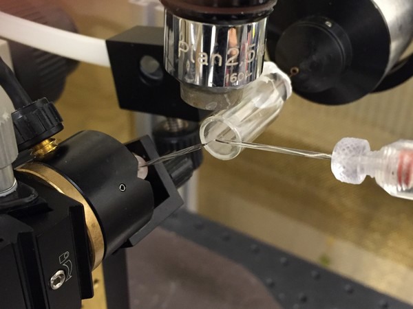 A mosquito tethered to the underside of a microscope stage for calcium imaging of its antenna lobe. Credit: Kiley Riffell