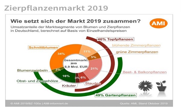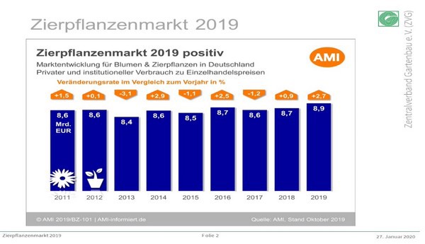 Interestingly, even though 2019 was a challenge with the weather situation (frosts the end of May and 40 degrees in summer), the ornamental plant market in Germany has grown by 2.7 percent to 8.9 million in 2019. But what does this say? According to Mertz, it shows that it is a market with a lot of potential. "We can be proud that this is the highest result ever after 2 years." When looking at the consumption per capita, in 2019 it was 105 and in 2019 it was 108. And 3 euro more consumption for per capita consumption increased from 105 euro to 108 euro. "And that time and 83 million inhabitants is a lot."