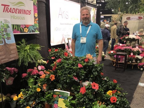 A customer visiting the booth with the potted plant line of Tradewinds Hibiscus™ with Aris genetics.