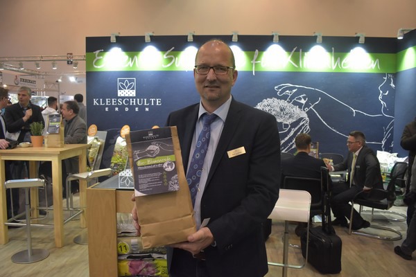 Ralf Schilling of Kleesschulte Erden presenting "Bio-Blumenerde" - which is peat and plastic free in a paper bag.